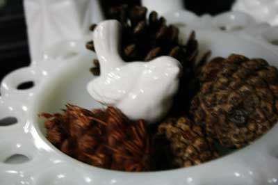 A blurry photo of some feathers and sparkly leaves in a vase.Some pinecones (cleaned, and found at the Arboretum) with my little ceramic bird from Common Folk Co. in a milkglass candy dish I found at the thriftstore.